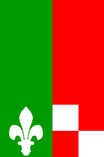 The second proposal of arms is vertically divided, "Vert a fleur de lis or and gules in chief checky gules and argent". The flag to go with this one was shown as a banner of the arms, in a vertical form with proportions c. 3:2.