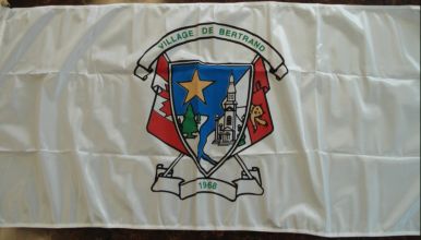 The flag of the Village of Bertrand, New Brunswick, is white with village coat of arms on it. Here is description of the arms in French:
