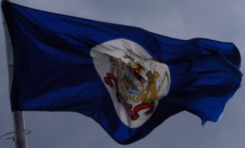 I took this photo in April 2005, though I first saw this flag in August 2004. The arms are placed on a white disk on a 1:2 blue field. Here is some information about the arms from the city website: