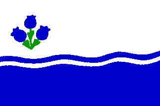 This flag is cited in The Saguenay Flag [hrg88a] as being the flag of the Lac-Saint-Jean part of the region. I am not sure exactly if it was a proposal or a short-lived flag, but currently the green-yellow flag with the grey-red cross is widely used in the region. The bottom blue part represents the lake, the triple blueberry stem is a reference to this popular berry in the region and to the popular nickname of the Lac-Saint-Jean residents: "Les Bleuets" 'the Blueberries'. Lac-Saint-Jean is considered to be formed of the three following counties: Lac-Saint-Jean-Est, Le Domaine-du-Roy and Maria-Chapdelaine.