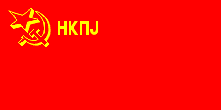 The New Communist Party of Yugoslavia has originally used flags similar to those of the League of Communists of Yugoslavia: a red five-pointed star in the canton, fimbriated gold and charged with gold hammer and sickle, with gold letters NKPJ beneath the star, all on red field. This was chosen as a symbol of ideological (though not legal) continuity with the early Communist Party of Yugoslavia (which since 1952 bore name League of Communists of Yugoslavia), whose flags differed only in the party name abbreviation (KPJ). I saw the flags only in 1992 elections campaign, but they must have been in use since 1990, when party was founded, until adoption of its present Constitution in 1995.