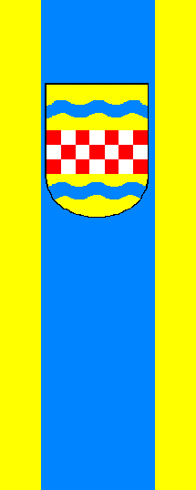 It is a blue flag with horizontal yellow stripes at the left and right edge. The ratio between the stripes is 1:3:1. Within the blue stripe is the coat of arms shifted to the top.