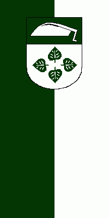 The ratio is approx. 2:1. It is a green - white vertical bicolour. The coat of arms is at the top of the banner.