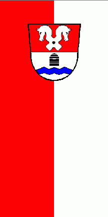 The ratio is approx. 2:1. It is a red - white vertical bicolour. The coat of arms is at the top of the banner.