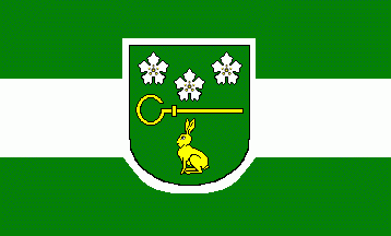 The flag's ratio is 3:5. It is a green over white over green horizontal triband. The coat of arms, fimbriated white, is in the centre of the flag.