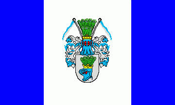 The flag's ratio is 3:5. It is a blue - white - blue vertical triband. The coat of arms is in the centre of the white stripe.