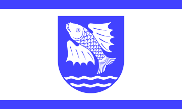 In a blue shield is a silver (= white) winged fish. The base is divided by two silver barrulets wavy.