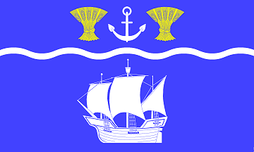 It is a blue shield. The chief is divided from the rest by a silver (=white) fess wavy. Below is a silver (=white) sailing ship with three masts (Holk). In the chief is a silver (=white) upright anchor flanked by two golden (= yellow) sheaves of grain.