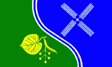 The shield is divided by a bendy s-shaped blue line fimbriated silver (=white). Above left are four silver (= white) windmill vanes in a blue field. Below right is a golden (=yellow) leaf of lindentree with an infructescence.