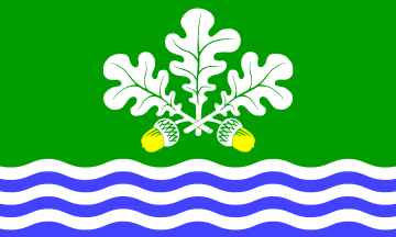 In a green field are three silver (=white) oak leaves over two golden (= yellow) acorns. The base is five times divided per fess wavy into silver (= white) and blue.