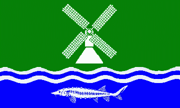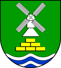 Description of coat of arms: In a green field is a silver (= white) windmill. A silver (=white) sturgeon (German: Stör) is in the blue base. Base and main field are separated by a silver (=white) fess wavy superimposed by a blue barrulet wavy. Meaning: The sturgeon probably is a canting element symbolizing the Stör river. The windmill is of that type, which was used to drain the marshes. The four vanes are symbolizing the four settlement cores: Kasenort, Honigfleth, Käthen and Stördorf proper. The waves are symbolizing the Stör river nad the creeks Bekau and Wüster Au. Source: Municipal Roll of Arms Schleswig-Holstein Online