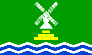 In a green field is a silver (=white) windmill over six golden (= yellow) bricks ordered 1:2.3. The base is three times divided per fess wavy into silver (= white) and blue.
