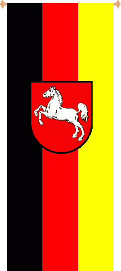 The black-red-gold national flag with the LowerSaxon arms (a white saxon horse on a red field) with a narrow black border, overlapping the black and gold stripes and slightly offset towards hoist. Adopted 1951. Illustrated in Smith 1975 p.227 and Dorling Kindersley 1997 p. 121.