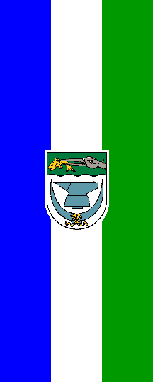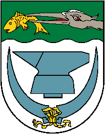 (1) Das Wappen der Stadt zeigt unter grünem Wellenschildhaupt, aus dem linken Schildrand wachsend, einen silbernen Reiherkopf mit einem goldenen Fisch im schnabel, in silber schwebend einen blauen Amboss, begleitet von zwei blauen, aufrecht zugewendeten, unten durch goldene Schleifen verbundene Sensenblätter.