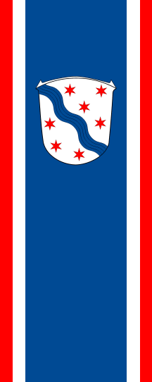 It is a vertical 5-stripes banner red-white-blue-white-red with ratio of stripes approx. 1:1:9:1:1. The coat of arms is shifted to the top within the central stripe.