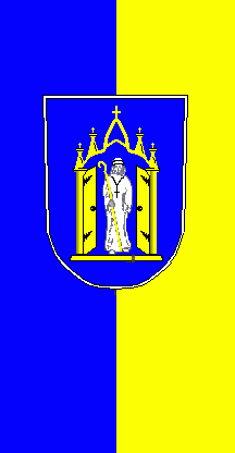 Description of banner: The ratio is estimated 15:8. It is a blue and yellow vertical bicolour with the coat of arms shifted to the top.