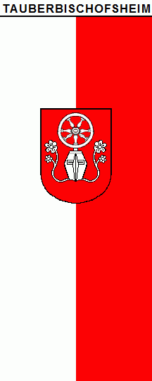 The ratio is approx 5:2. The banner is a vertical white - red bicolour. The coat of arms of the city is shifted slightly to the top. At the top of the banner is a black inscription "TAUBERBISCHOFSHEIM" underlined black.