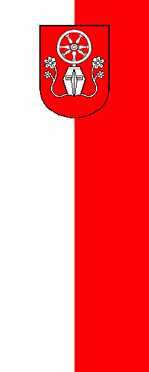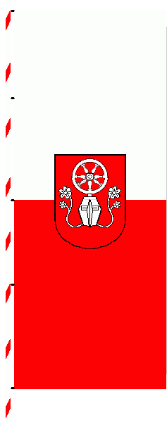 The ratio is approx 5:2. The banner is a vertical white - red bicolour. At its top is the coat of arms of the city.
