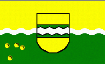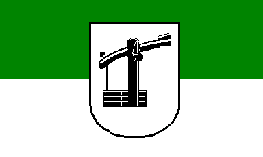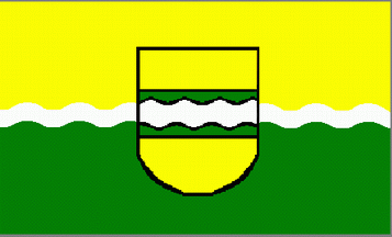It is a yellow over green bicolour, both colours divided by a white, fessy, wavy line. In the centre of the flag the coat of arms is superimposed in that way, that the wavy lines on cloth and coat