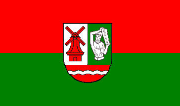 It is a red over green horizontal bicolour with the coat of arms in