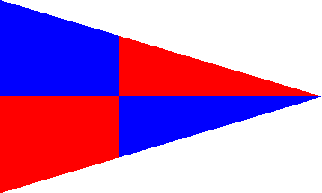 Pennant made up of a broad vertical blue stripe [on the hoist], two white, isosceles triangles placed vertically, with their bases on the blue stripe, and a red lozenge on the fly. A white wolf trap is placed vertically in the blue stripe.