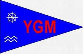 It is a blue pennant. In the upper hoist is a white steering wheel, in the lower hoist two white barry wavy lines. Shifted to the flyend are red capital letters "YGM".