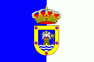 The La Palma flag with coat of arms is vertically divided into blue and white with the coat of arms in its centre: in a blue field above blue and silvery (white) waves a golden (yellow) masoned and embattled tower. Above the pinnacles is a bust of St. Michael, nimbed golden (yellow), dressed in silver (white) armour with a red skirt in Roman legionnaire style. He is holding golden scales in his right hand. Upon the sinister side a golden (yellow) palm tree seems to grow straight out of the waves. The shield has a golden (yellow) bordure superimposed by five purple violet blossoms. The shield is topped by a crown. The coat of arms was finally adopted per decree of the Ministerio de la Gobernación from 10 October 1975.