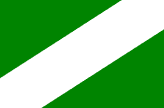 Flag: The length of the flag shall be one and a half its width. The panel shall be emerald green with a bend sinister (a stripe than runs from the lower left to the upper right angle), in height 1/3 of the flag's height.