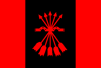 I purchased a 3"x5" flag of the Falange Party when I visited the Valley of the Fallen monument outside Madrid. The flag is equally divided into 3 vertical stripes red-black-red with a yoke of 5 red arrows [and yoke] in the black center panel.