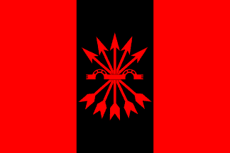 Keywords: falange española | la falange | fe de las jons | arrows: 5 (red) | yoke (red) | free fatherland | patria libre | quartered: saltire (black-red) | disc (white) | pl |