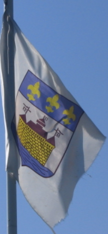 An old car sticker shows the fleurs-de-lis slightly mal ordonnées and the castle or; Timms notes that "the illustration on the letterhead of the municipal administration shows the castle or on a field argent".