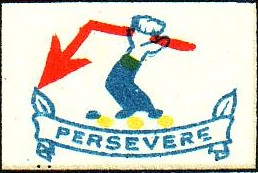 "PERSEVERE" in blue. Between sleeve and ribbon three yellow stars (?). Caption: