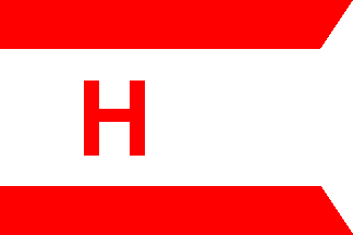 swallow-tailed burgee divided vertically by three wavy lines. A red 'H' is