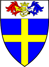 In blue a golden/yellow cross and in chief in silver/white a bucket helmet turned to dexter with a golden/yellow crown and mantle: dexter red-golden/yellow, sinister blue-silver/white."