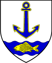 The coat of arms is prescribed as "Argent an anchor azure and in the base a fish (carp) or on a fess of the second". The fess is not mentioned as wavy.