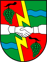 The coat of arms of Sveti Ilija is "Quarterly, first and fourth gules a bunch of grapes vert slipped sable, second and third vert a fess wavy argent, overall a thunderbolt in pale and two arms grasping hands proper issuant from flanks clad argent".