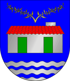 The arms are Azure a house Argent open Vert and covered Gules and in chief two olive branches in inverted chevron and on a base wavy Argent two barrulets Azure wavy. Mural crown argent with three visible towers (commune rank) and white scroll reading in black upper case letters "Pego - Abrantes". Original blazon: