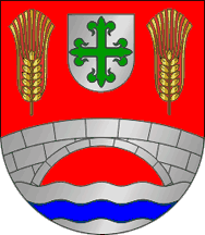 The arms are Gules a bridge Argent masoned Sable issuant from a base wavy Argent charged with a fesslet wavy Azure and in chief on an escutcheon Argent a cross fleury Vert and the escutcheon flanked by two ears of wheat Or. Mural crown argent with three visible towers (commune rank) and white scroll reading in black upper case letters "Seda". Original blazon: