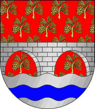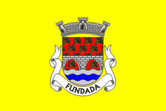 The arms are Gules semy of pine twigs Or each with its cone a two-arch bridge Argent masoned Sable issuant from a base wavy Argent chages with a bar wavy Azure. Mural crown argent with three visible towers (commune rank) and white scroll reading in black upper case letters "Fundada". Original blazon: