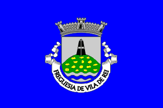 The arms are Argent issuant from a mound vert semy of pebbles Or a triangulation pillar Sable and on a base wavy Argent a bar wavy Azure. Mural crown argent with three visible towers (commune rank) and white scroll reading in black upper case letters "Freguesia de Vila de Rei". Original blazon: