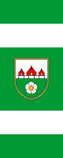 The flag is rectangular, in proportions 2:5, green with two vertical white stripes forming a square field in the middle and two green fields on the edge of the flag, with proportions 3:3:8:3:3. In the middle there is the grebe from the coat of arms.