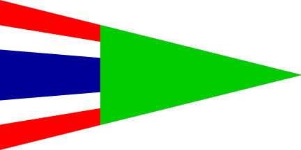 This is a triangular flag with a base measuring half of each side. For one third of its length, it consists of the same colours that one finds on the Trairanga while the section that tapers off to a point is green. [Identical to the Customs Pennant above, but with a normal green (V) instead of a light one (V-); actually this image certainly has a 1:2 ratio, whereas the Singha Beer source image is a 2:3 burgee.]This is an official flag, designed to be flown from a ship on a special mission in accordance with a special Royal Decree concerning Flag, issued in B.E.2479 [1936 AD]. Nowadays it is known as Custom Officer's Flag.