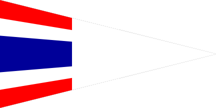 This is a triangular flag with a proportion of base to height being 1:2. One-third of the flag is the same colours as the Trairanga, while the section tapering off to a point is white. [Identical to the Harbour Administration Pennant above; actually this is more correct as it certainly has a 1:2 ratio, whereas the Singha Beer source image is a 2:3 burgee.]This is an official flag, to be flown from the mast of a ship on an official mission in accordance with a special Royal Decree, issued in B.E.2479 [1936 AD], concerning flags. Nowadays, it is known as the Harbour Inspector's Flag.