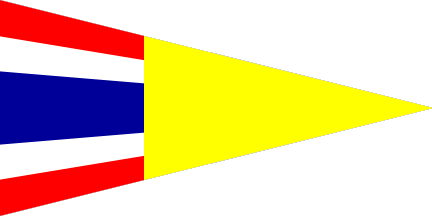 This is a triangular flag with a base proportion to the height, being 1:2. For on[e] third of its length, it consists of the same colours that one finds on the Trairanga, while the section that tapers off to the point is red. [Identical to the Post Office Pennant above; actually this is more correct as it certainly has a 1:2 ratio, whereas the Singha Beer source image is a 2:3 burgee.]This was an official flag, designed to be flown from a ship on a special mission in accordance with a special Royal Decree concerning Flags, issued in B.E.2479. Its use was discontinued in B.E.2522 [1979 AD].