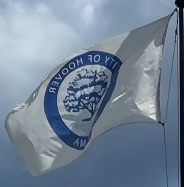 A white flag with the name in blue.