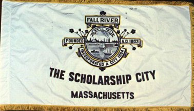 Fall River is in Bristol County, southeastern Massachusetts. The flag is white, with the town seal - a harbor scene, with a banner above WE'LL TRY, the slogan and state name below.