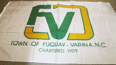 A white flag with the town logo depicting the letters F and V in a green partially inside a gold frame.