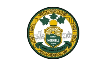 I took a picture of the flag of Hornell which happens to hang in the Wal-Mart. The flag is dark green (going by browser-safe colours it's V++), with the logo of Hornell in the top centre, a green maple leaf growing out the base of a white rounded square, reflecting it's nickname of "Maple City". In the lower centre of the flag is the word 'Hornell', in a distinctive typeface, in black italics.
