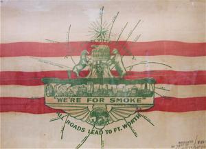 Description: The earlier flag of Fort Worth was apparently unofficial. A flag maker, J.J. Langever, designed it in 1912. Proportioned 4:7, the flag has a white field with three horizontal red stripes placed across its center creating alternating white and red stripes 25:3:3:3:3:3:25. Superimposed on the center of the field over the red stripes is an elaborate design in light blue (perhaps faded from an earlier darker blue). Centered above the lowest red stripe is a city skyline, its narrow sky filled with industrial smoke depicted over it. Resting on this portion is a sort of pillar on which a panther crouches, facing the hoist. A horse and a sheep support the pillar. Over the panther curves THE PANTHER CITY in blue. Centered above all is a five-pointed star, with half of each point shaded to give the appearance of three dimensions, and a halo of radiant lines around it. Below the skyline is a white rectangle bordered in blue, announcing "WE'RE FOR SMOKE", also in blue. All this is supported by what appears to be a white sphinx, an image popular at the time. Curved counter-clockwise below the image is another legend, ALL ROADS LEAD TO FT. WORTH, in blue. To illustrate this motto, 17 blue lines, apparently representing actual, individually labeled roads, emanate from behind the design in all directions.submitted by Jarig Bakker, 15 July 2004