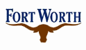 Horizontally divided blue-white-green, on the blue stripe FORT WORTH in black, on the white stripe a stylized longhorn head in black, on the green stripe TEXAS in black.
